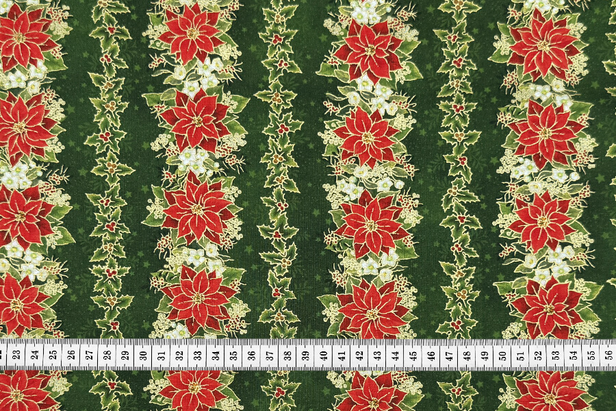 Дизайн ткани выполнен в тематике "Цветы, Новый год, Полоски, Металлик".